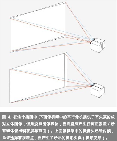 在不失真的情况下实现内倾效果的一种方法是在水平移动镜头或像机的图像传感器时使像机的轴保持平行,从而取得所需的零视差。虽然这对 CG 像机非常容易,当然对真实像机却相当复杂,但是数字工具使我们能够通过移动图像来生成所需的零视差设置,从而达到相同的效果,而不会出现梯形失真或深度平面弯曲缺陷。